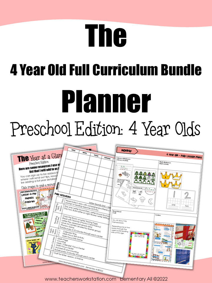 If you have really young 4’s or 3’s, I also have a curriculum bundle for three year olds that has been super successful in my classroom and in my school. This is a collection of everything I use to teach math and literacy to three year olds. Lesson plans, printables, minilessons, and centers are included in this bundle of resources.
